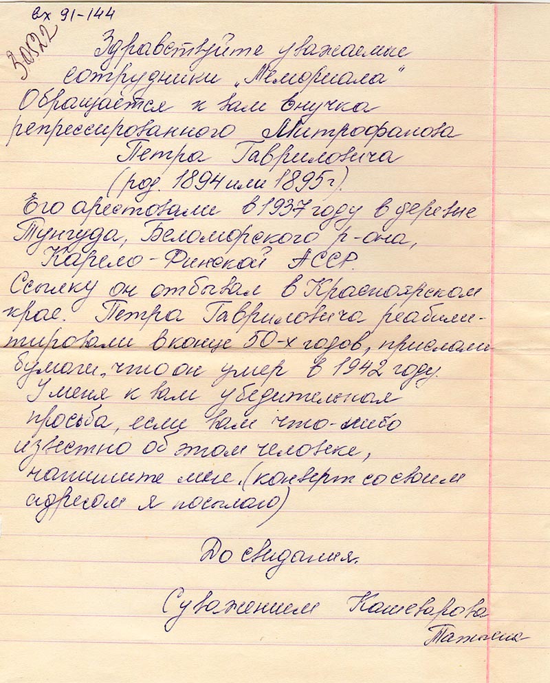 Ссылку он отбывал в Красноярском крае. Петра Гавриловича реабилитировали в конце 50-х годов, прислали бумаги, что он умер в 1942 году. У меня к вам убедительная просьба, если вам что-либо известно об этом человеке, напишите (конверт со своим адресом я посылаю)