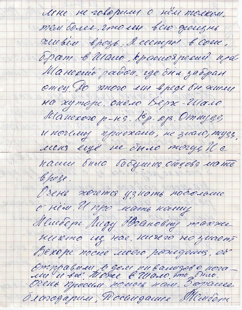 Так-как я в семье самая маленькая, ни брат, ни сестры никогда ничего мне не говорили о нем толком, тем более, что мы всю жизнь живем врозь. 2 сестры в Сочи, брат в Шало, Красноярский край, Манский район, где был забран отец. До этого мы вроде бы жили на хуторе, около Верх-Шало Манского р-на Кр. кр. Откуда и почему приехали, не знаю, туда меня еще не было тода. И с нами была бабушка, отцова мать вроде.