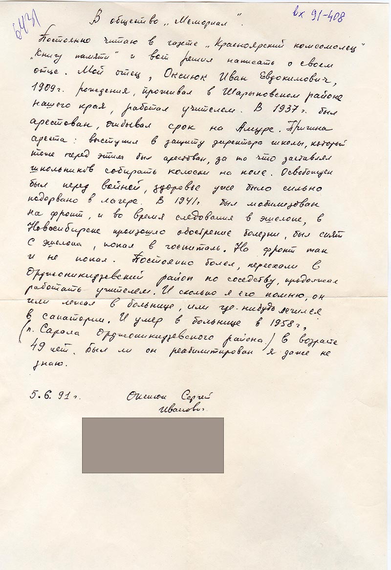 Постоянно читаю в газете «Красноярский комсомолец» «Книгу памяти» и вот решил написать о своем отце. Мой отец, Оксиюк Иван Евдокимович, 1909 г. рождения проживал в Шарыповском районе нашего края, работал учителем. В 1937 г. был арестован, отбывал срок на Амуре. Причина ареста: выступил в защиту директора школы, который тоже перед этим был арестован, за то что заставлял школьников собирать колоски на поле. Освобожден был перед войной, здоровье уже было сильно подорвано в лагере. В 1941 г. был мобилизован на фронт, и во время следования в эшелоне, в Новосибирске произошло обострение болезни, был снят с эшелона, попал в госпиталь. На фронт так и не попал. Постоянно болел, переехали в Орджоникидзевский район по соседству, продолжал работать учителем. И сколько я его помню, он или лежал в больнице, или где-нибудь лечился в санатории. И умер в больнице в 1958 г. (п. Сарала Орджоникидзевского района) в возрасте 49 лет. Был ли он реабилитирован я даже не знаю.
