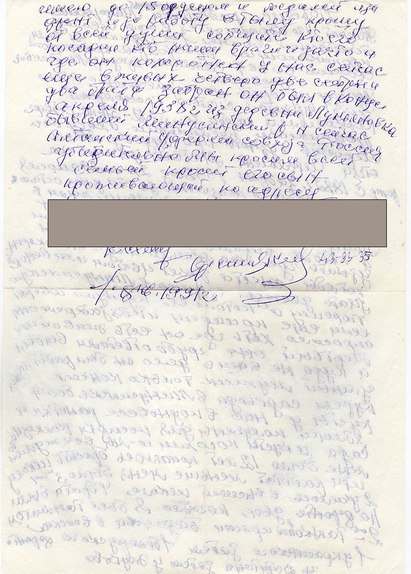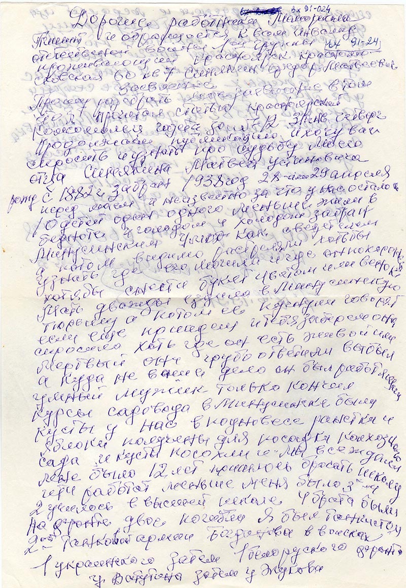 Прошу разобрать мое заявление в том, что я прочитал статью «Красноярский комсомолец» газета за № 12 от 31 янв. четверг Продолжаем публикацию. И хочу вас спросить и узнать про судьбу моего отца Синякина Матвея Устиновича рожд. с 1882 г. забран 1938 год 28 или 29 апреля перед маем и неизвестно за что у нас осталось 10 детей один одного меньше жили в бедноте и голодом и холодом забран Минусинским УМВД как сведетелем а потом видимо растреляли хотьбы узнать где его могила и где он похоронен хотя бы снести букет цветом или венок.