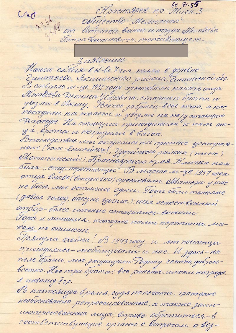 Грянула война! В 1943-м году и мы поселенцы пригодились – мобилизовали и нас. И здесь на поле брани мы защищали Родину честно, добросовестно. Нас три брата, все ранены, имеем награды, я инвалид II группы. В настоящее время судя по печати, граждане необоснованно репрессированные, а также заинтересованные лица, вправе обратиться в соответствующие органы с вопросом о возможном возврате лишенного конфискованного имущества. Но у меня нет справки о реабилитации, на основании которой я должен получить удостоверение. Убедительно прошу оказать помощь в получении такой справки. По данному вопросу я обращался в прошлом году в краевую прокуратуру, но ответа не получил