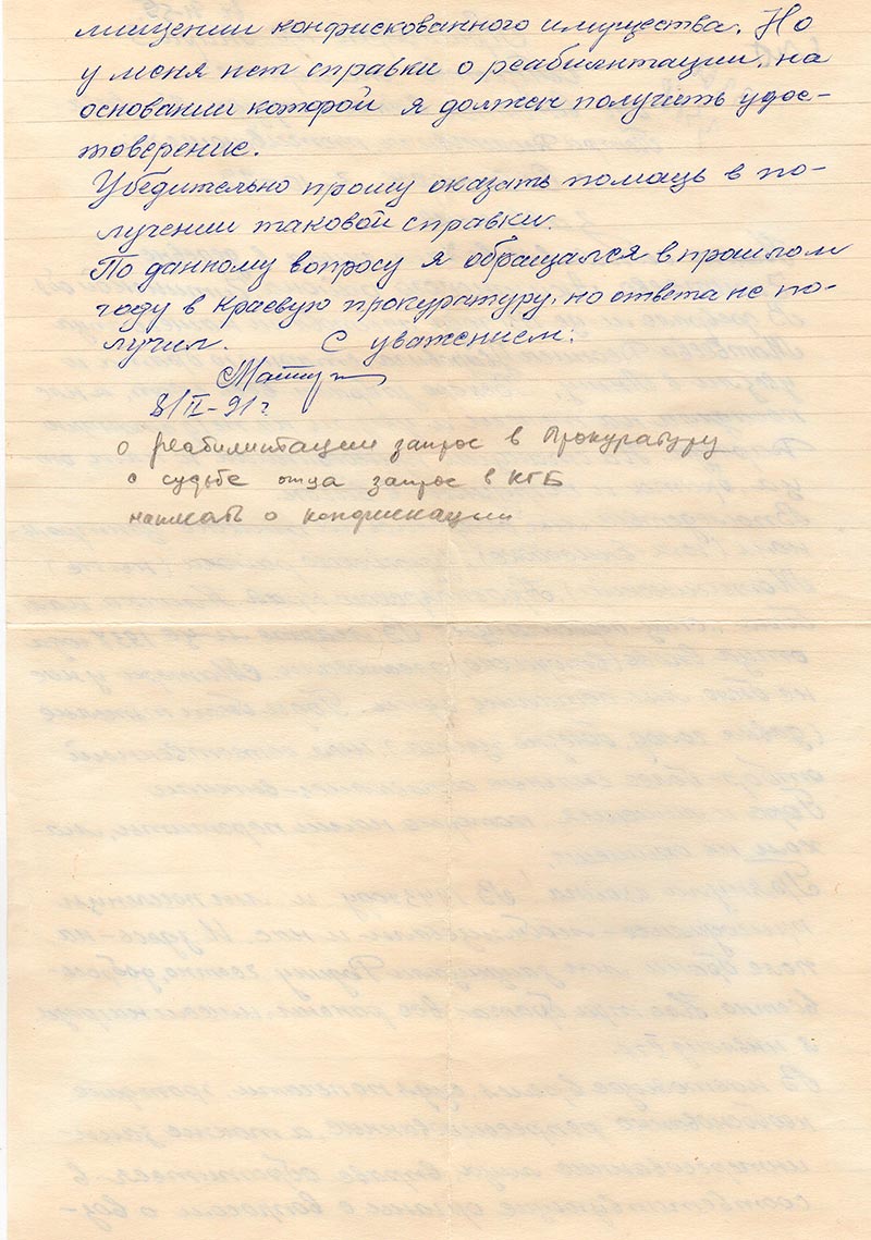 примечание карандашом: о реабилитации запрос прокуратуру, о судьбе отца запрос в КГБ, написать о конфискации.
