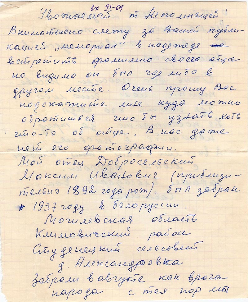 Мой отец Добросельский Максим Иванович (приблизительно 1892 года рож) был забран 1937 году в белоруссии.