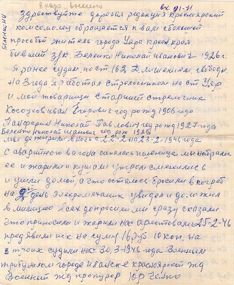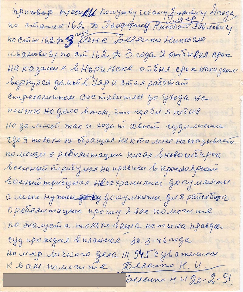Приговор огласили Косоухову Ивану Егоровичу 4 года по ст. 162 Д (умер), Панферину Николаю Павловичу по ст. 162 Д 3 года, мне Беленко Николаю Ивановичу по ст. 162 Д 3 года. Я отбывал срок наказания в Норильске, отбыл срок наказания, вернулся домой в Уяр и стал работать стрелочником составителем до ухода на пенсию, но дело в том, что где бы я не был за мной так и ходит хвост судимости, где я только не обращал не кто мне не оказывает помощи о реабилитации, писал в Новосибирск. Военный трибунал не сохранились документы, а мне нужны документы для райсобеса о реабилитации. Прошу я вас помогите пожалуйста только ваша истина правды.