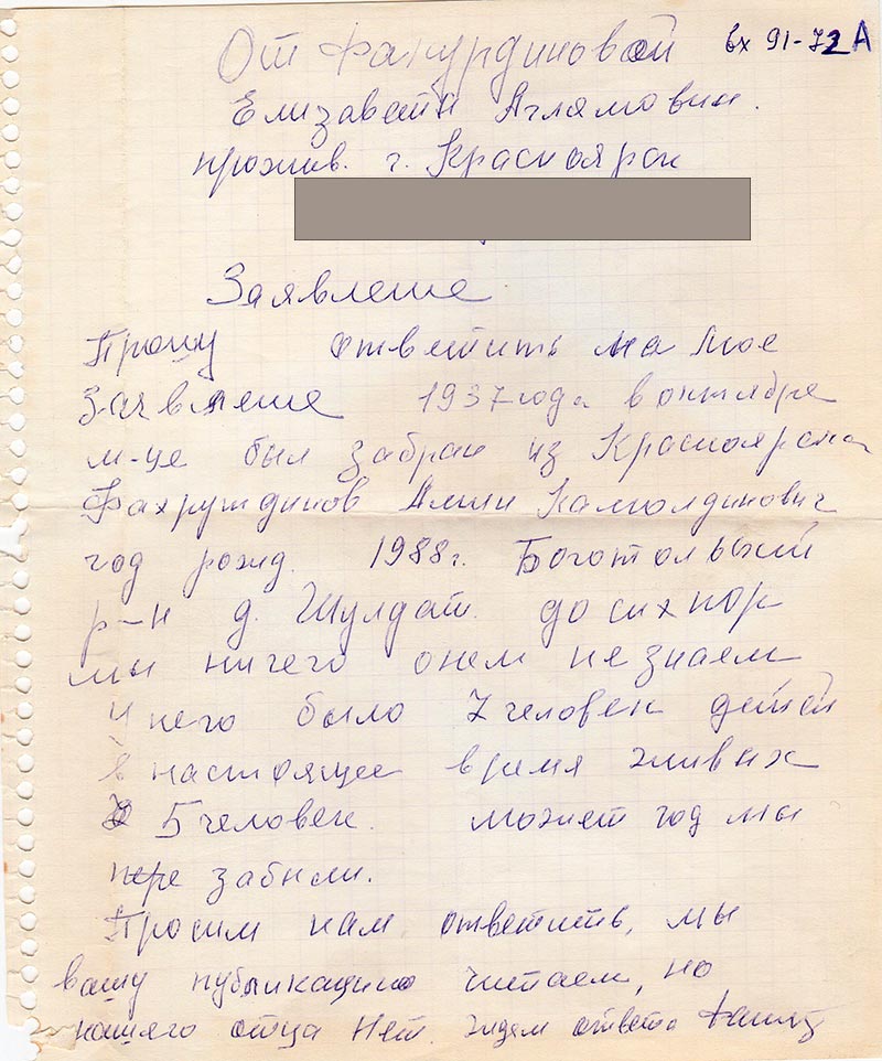 Прошу ответить на мое заявление 1937 года в октябре м-це был забран из Красноярска Фахрутдинов Амин Камолдинович год рождения 1988 г. Боготольский р-н д. Шулдат до сих пор мы ничего о нем не знаем.