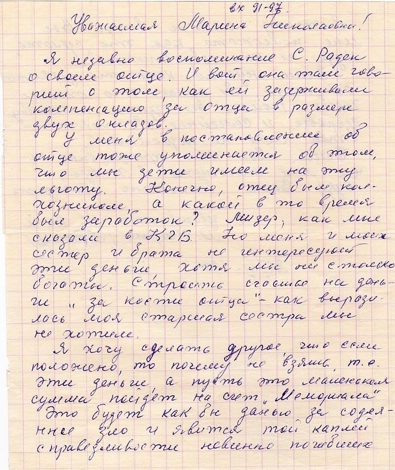Я хочу сделать другое, что если положено, то почему не взять, т.е. эти деньги, а пусть это маленькая сумма пойдет на счет «Мемориала». Это будет как бы данью за содеянное зло и явится той каплей справедливости неповинно погибших.