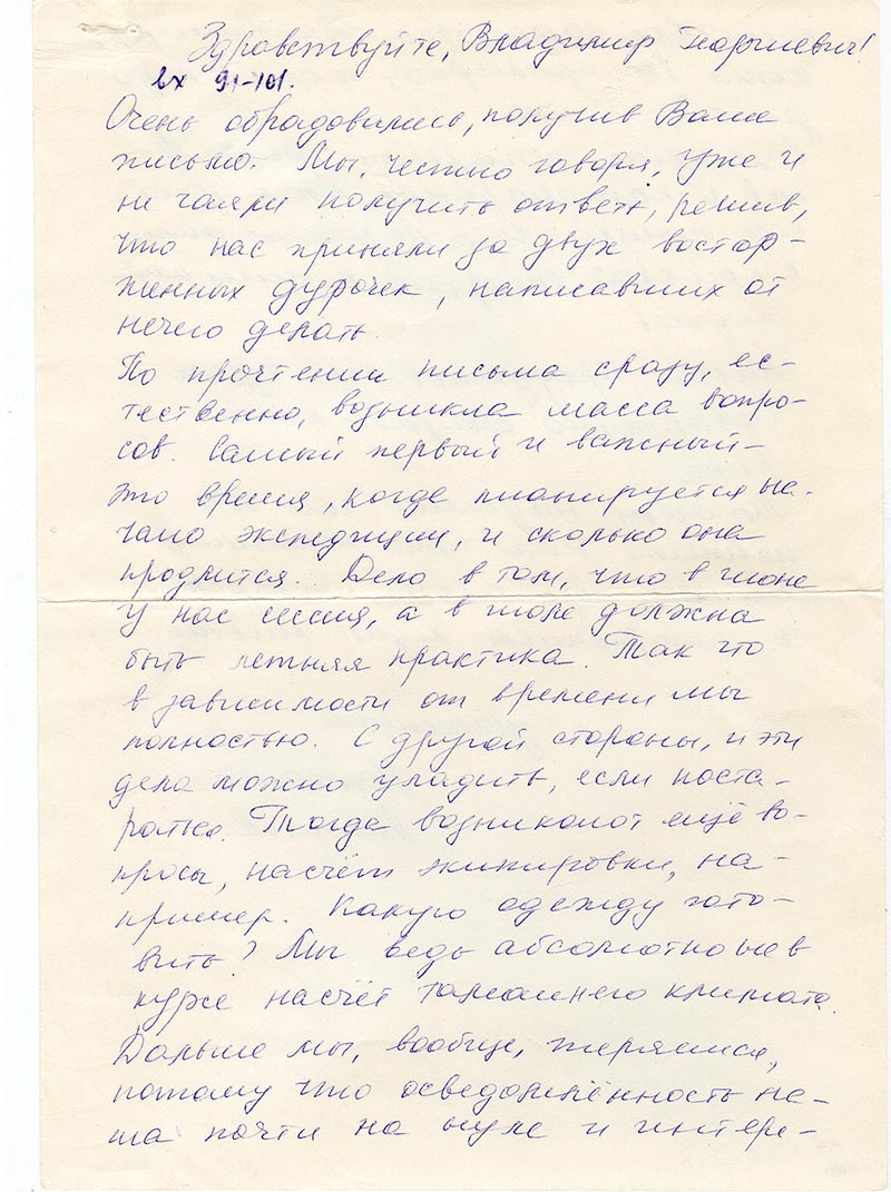 По прочтении письма сразу, естественно, возникла масса вопросов. Самый первый и важный это время, когда планируется начало экскурсии, и сколько она продлится. Дело в том, что в июне у нас сессия, а в июле должна быть летняя практика. Так что в зависимости от времени мы полностью. С другой стороны, и эти дела можно уладить, если постараться. Тогда возникают еще вопросы, насчет экипировки, например. Какую одежду готовить? Мы ведь абсолютно не в курсе насчет тамашнего климата.