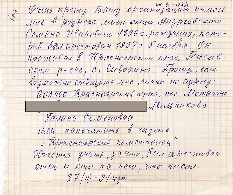 Очень прошу Вашу организацию помочь мне в розыске моего отца Андриевского