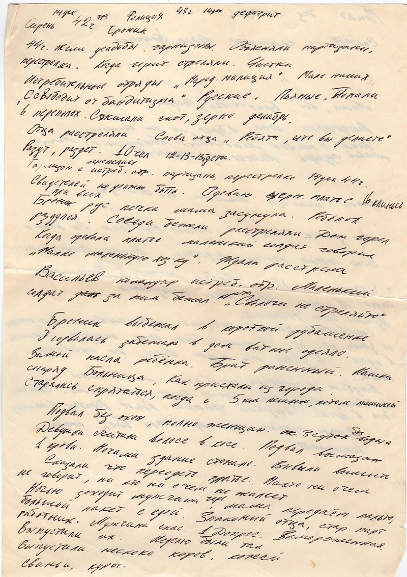 44 г. Жгли усадьбы, гарнизоны. Объясняли партизаны, перестрелка. Когда горит стреляли. Чистки.