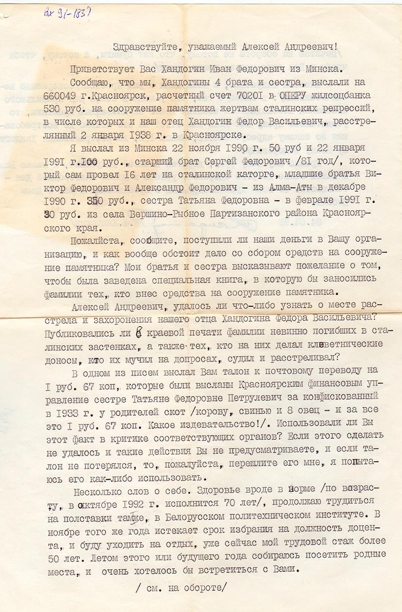 Сообщаю, что мы, Хандогины 4 брата и сестра, выслали на 660049 г. Красноярск, расчетный счет 70201 в ОПЕРУ жилсоцбанка 530 руб. на сооружение памятника жертвам сталинских репрессий, в числе которых и наш отец Хандогин Федор Васильевич, расстрелянный 2 января 1938 г. в Красноярске.