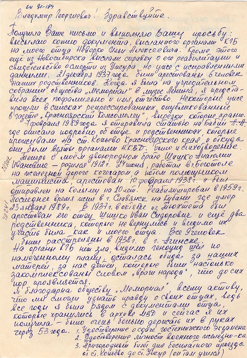 Получила Ваше письмо и выполняю Вашу просьбу: высылаю копию документа, высланного органами КГБ на моего отца Неверко Ильи Алексеевича. Кроме этого еще из Новосибирска высылаю справку о его реабилитации и свидетельство о смерти из Ужура, но уже с исправленными данными. 21 декабря 1937 года были арестованы 6 человек наших родственников. Когда я была на учредительном собрании общества «Мемориал» в музее Ленина, я представили всех пофамильно и имя, отчество. Некоторые уже прошли в списках репрессированных, опубликованные в газете «Красноярский Комсомолец», вырезки, которые храню.