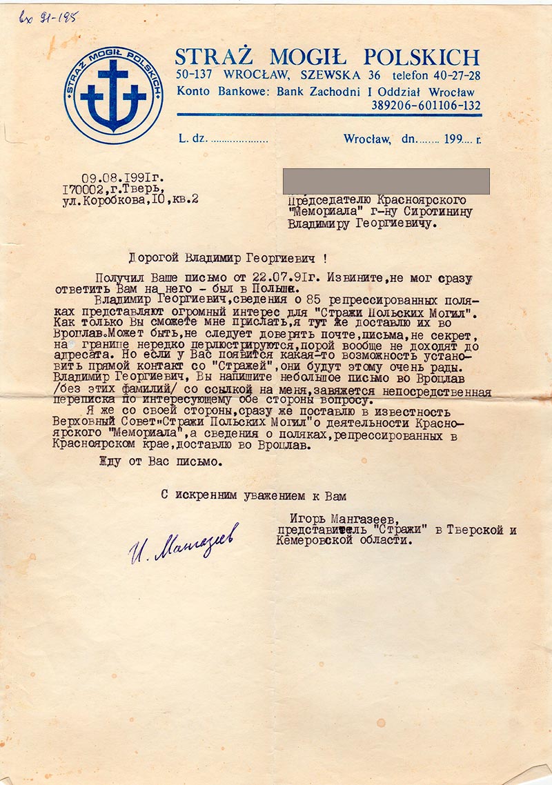 Я же со своей стороны, сразу же поставлю в известность Верховный Совет «Стражи Польских Могил» о деятельности Красноярского «Мемориала», а сведения о поляках, репрессированных в Красноярском крае, доставлю во Вроцлав.