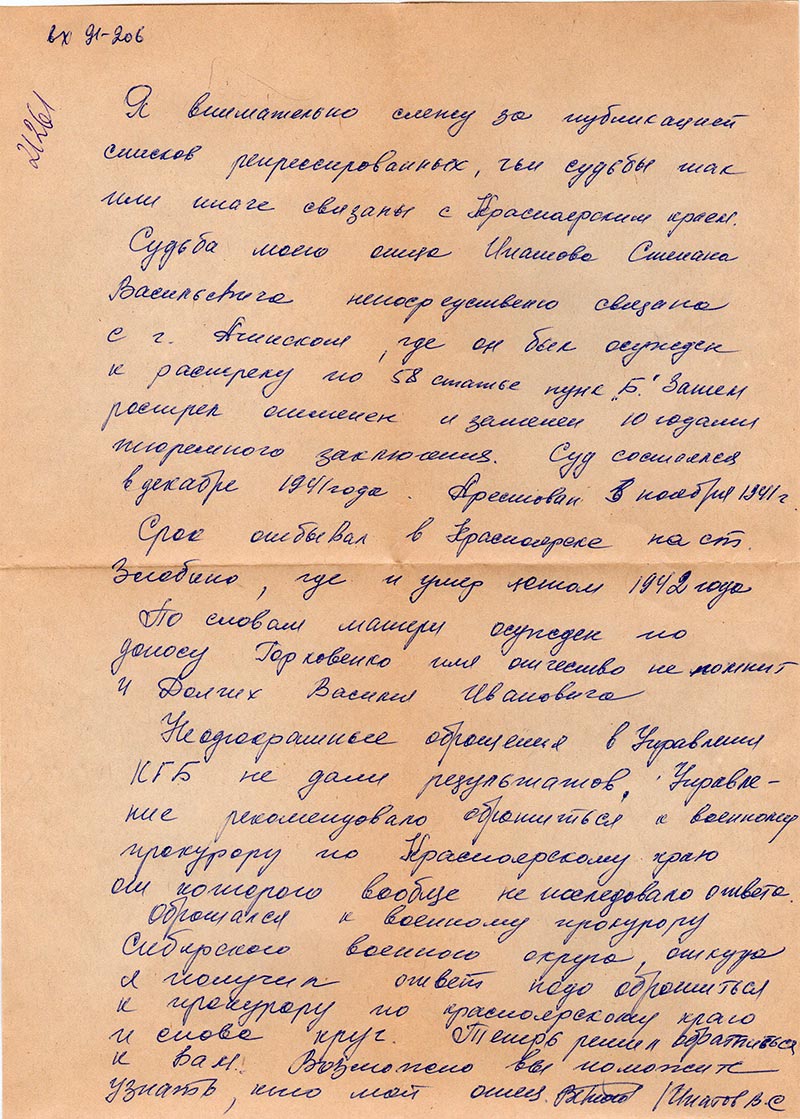 Неоднократные обращения в Управление КГБ не дали результатов. Управление рекомендовало обратиться к военному прокурору по Красноярскому краю, от которого вообще не последовало ответа.