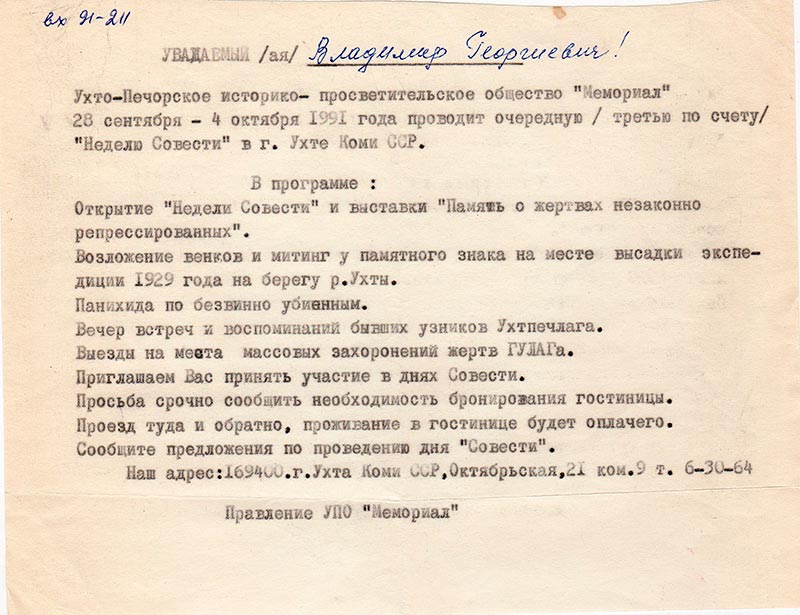 Ухто-Печерское историко-просветительское общество «Мемориал» 28 сентября – 4 октября 1991 года проводит очередную /третью по счету/ «Неделю Совести» в г. Ухте Коми ССР.