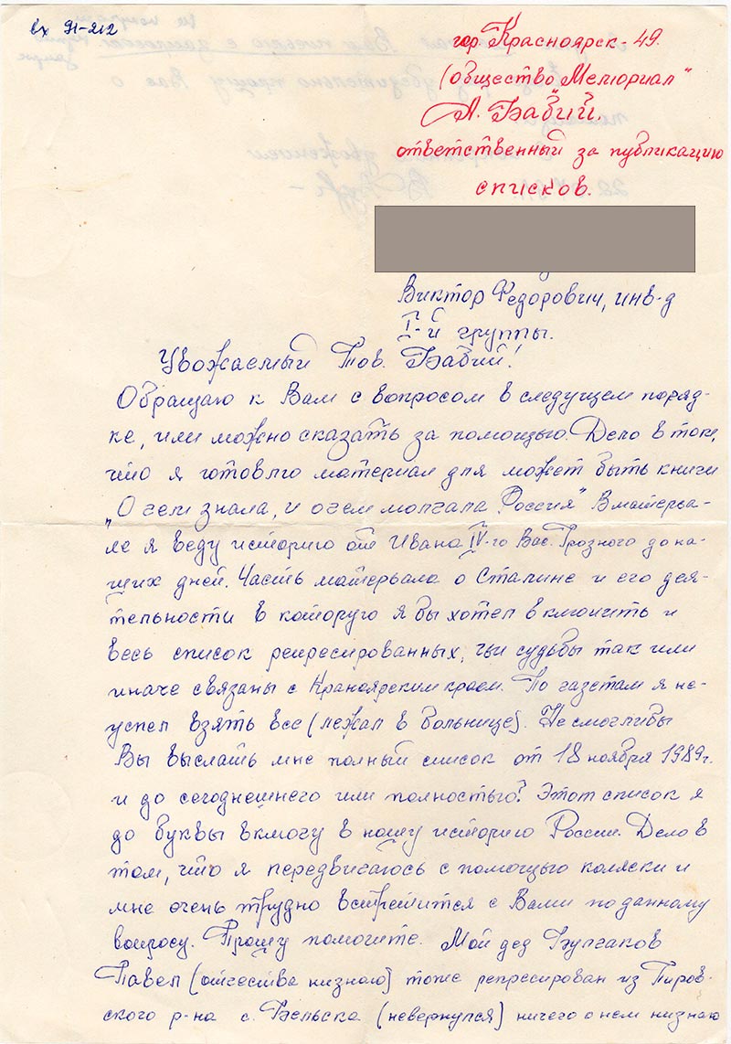 Обращаю к Вам с вопросом в следущем порядке, или можно сказать за помощью. Дело в том, что я готовлю материал для может быть книги «О чем знала, и о чем молчала Россия» В материале я веду историю от Ивана IV-го Вас. Грозного до наших дней. Часть материала о Сталине и его деятельности в которую я бы хотел включить и весь список репресированных, чьи судьбы так или иначе связаны с Красноярским краем. По газетам я не успел взять все (лежал в больнице). Не смоглибы Вы выслать мне полный список от 18 ноября 1989 г. и до сегоднешнего или полностью. Этот список я до буквы включу в нашу историю России. Дело в том, что я передвигаюсь с помощью коляски и мне очень трудно встретиться с Вами по данному вопросу.