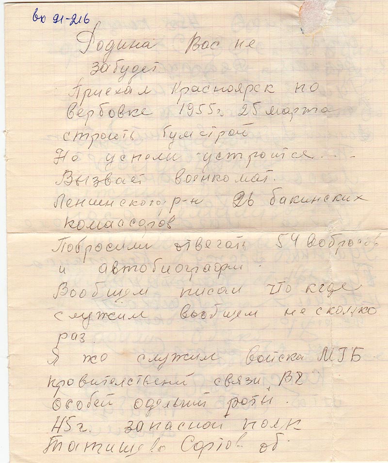 Приехал Красноярск по вербовке 1955 г. 25 марта строить бумстрой. Не успели устроиться… вызвает военкомат. Ленинского р-н 26 бакинских комиссаров. Побросили отвечать 54 вобросов и автобиография. Вообщем писал что кгде служил вообшем не сколько раз.
