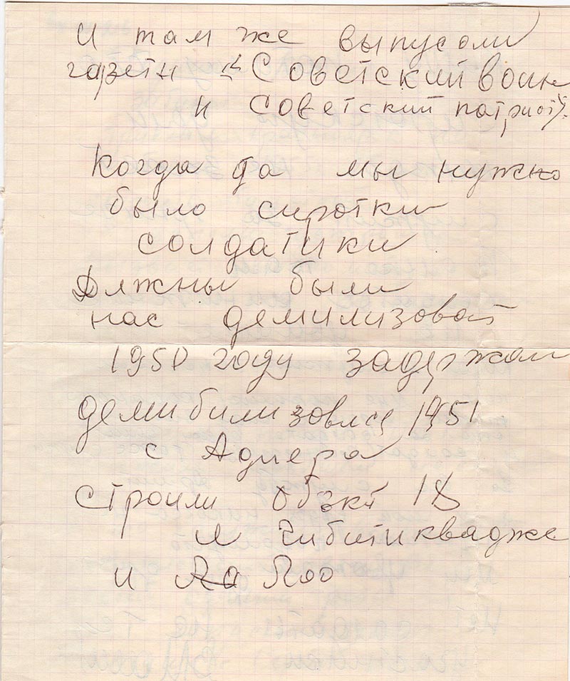 Длжны были нас демилизоват 1950 году задержали демибилизовлся 1951 с Адлера строили объкт 18 и Чибитиквадже и Лоо