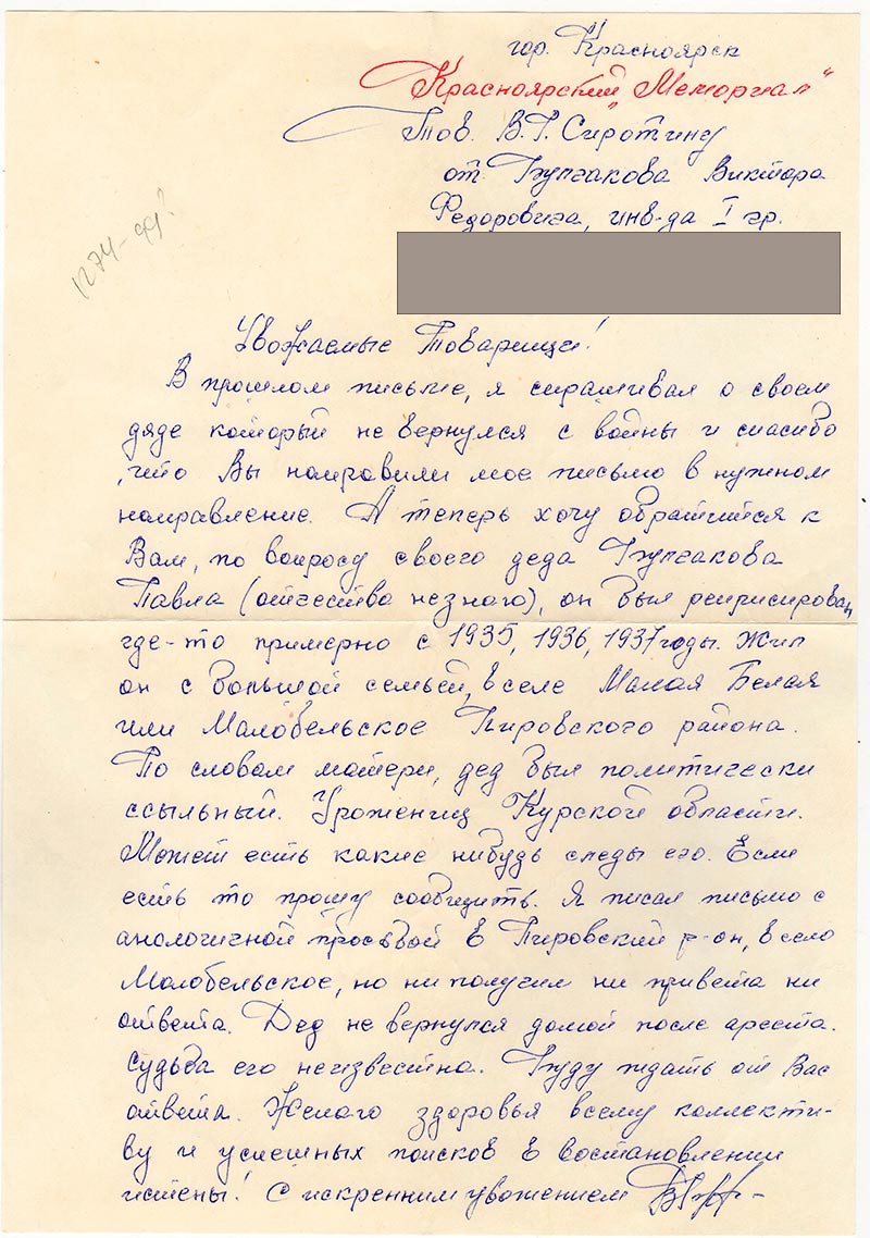 По словам матери, дед был политически ссыльный. Уроженец Курской области. Может есть какие нибудь следы его. Есть есть то прошу сообщить. Я писал письмо с анологичной просьбой в Пировский р-он, в село Малобельское, но ни получил ни привета ни ответа. Дед не вернулся домой после ареста. Судьба его не известна. Буду ждать от Вас ответа. Желаю здоровья всему коллективу и успешных поисков в востановлнии истены!