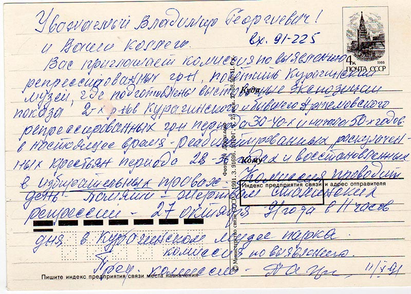 Вас приглашает комиссия по выявлению репрессированных гр-н, посетить Курагинский музей, где подготовлены выстовочные экспозиции показа 2-х р-нов Курагинского и бывшего Артемовского репрессированных гр-н периода 30-40-х и начала 50-х годов в настоящее время - реабилитированных, раскулаченных крестьян периода 28-36 годах и восстановленных в избирательных правах. Комиссия проводит день Памяти – Жертвам сталинских репрессий – 27 октября 91 года в 11 часов дня в Курагинском музее парка.