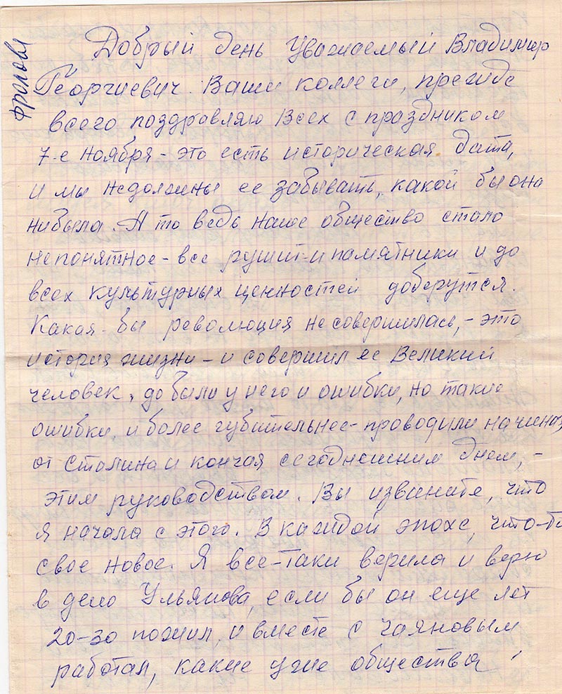 Добрый день Уважаемый Владимир Георгиевич. Ваши коллеги, прежде всего поздравляю Всех с праздником 7-е ноября – это есть историческая дата, и мы недолжны ее забывать, какой бы она нибыла. А то ведь наше общество стало непонятное – все рушит и памятники и до всех культурных ценностей доберутся. Какая бы революция не совершилась, - это история жизни – и совершил ее Великий человек, до были у него и ошибки, но такие ошибки, и более губительнее – проводили начиная от Сталина и кончая сегодняшним днем, - этим руководством. Вы извините, что я начала с этого. В каждой эпохе, что-то свое новое. Я все-таки верила и верю в дело Ульянова, если бы он еще лет 20-30 пожил, и вместе с Чаяновым работал, какие уже общества крестьянские были образованы, и с какой любовью вступали крестьяне, и не были бы крестьяне раскулаченными, а Сталин все завалил и погубил народ, а теперь еще и на Ульянова-Ленина все сваливают, ищут козла в огороде.