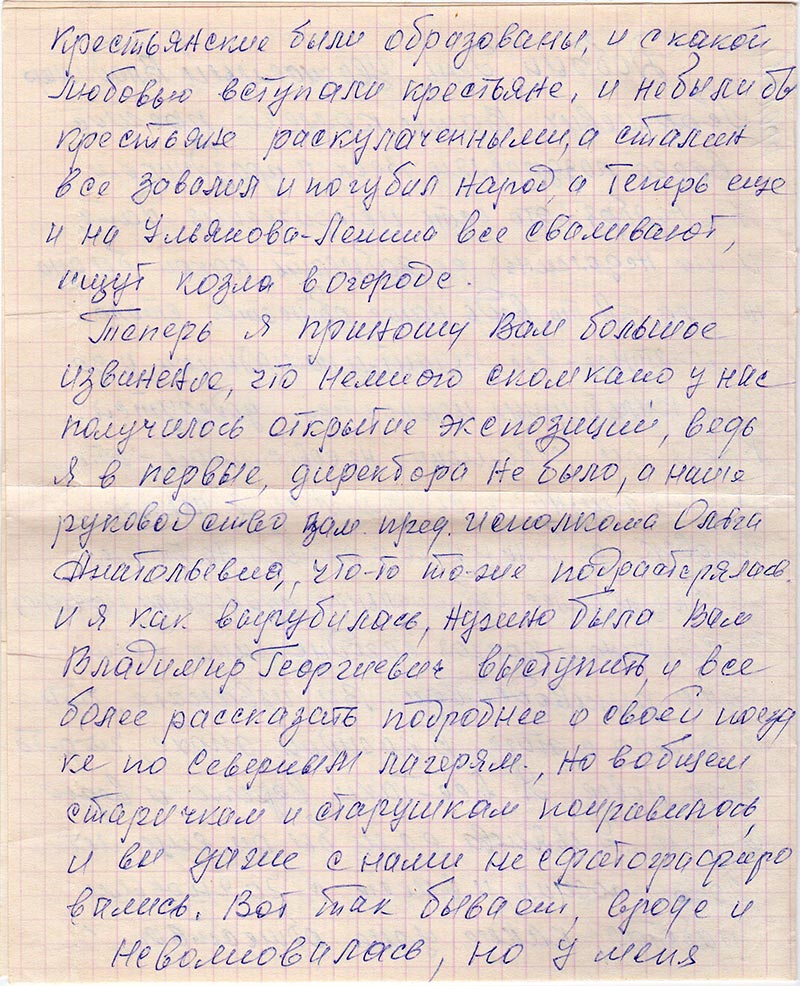 Теперь я приношу Вам большое извинение, что немного скомкано у нас получилось открытие экспозиций, ведь я в первые, директора не было, а наше руководство зам. пред. исполкома Ольга Анатольевна, что-то то-же подрастерялась. И я как вырубилась, нужно было Вам Владимир Георгиевич выступить, и все более рассказать подробнее о своей поездке по Северным лагерям. Но вобщем старичкам и старушкам понравилось, и вы даже с нами не сфотографировались. Вот так бывает, вроде и не волновалась, но у меня были мысли, как лучше провести и довести все экспозиции до людей, чтобы они могли все понять, всю правду прошлых лет, они еще просят рассказать. Но пока нет директора музея, ключ отдала Ольге Николаевне, а она постеснялась прийти на открытие.