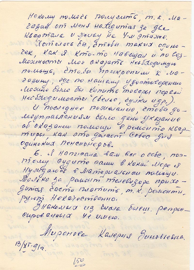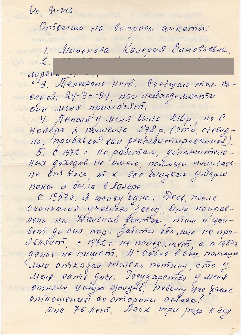 С 1957 г. я живу одна. Дочь, после окончания учебного завед., была направлена на Дальний восток, там и живет до сих пор. Заботы обо мне не проявляет, с 1972 г. не приезжает, а с 1984 г. даже не пишет. А Собес в соц. помощи мне отказал только потому, что у меня есть дочь. Государство у меня отняло целую жизнь, почему же такое отношение со стороны собеса?