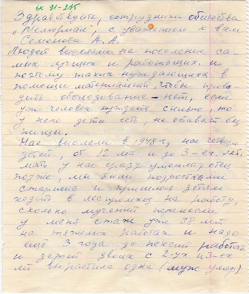 Здравствуйте, сотрудники общества «Мемориал», с уважением к вам Семенова А. А.