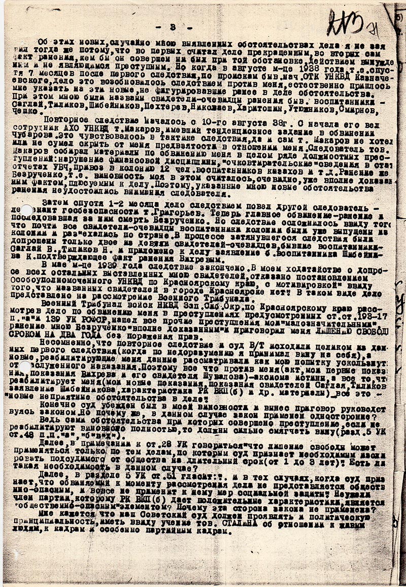 Считая, что обвиняемый “признался” – ожидают приезда Военной Коллегии и для того, чтобы эти вымышленные показания части обвиняемых были-бы подтверждены и нашло-бы свое отражение “ в правильности работы следователей” Блинов и Стрельник поехали в Новосибирск “учится” как лучше перед Военной коллегией провести дела. Получивши там видимо значительный опыт и приехав в Красноярск, получили не отрадную картину т.е. большинство правых “разложились” т.е. стали отказываться от показаний подписанных ими и составленные следователями, тогда в УНКВД – начинается так называемый “ВОССТАНОВИТЕЛЬНЫЙ ПЕРИОД” из переферии вызывают сотрудников УГБ, Ясюка, кожевникова, Кузнецова из Абакана Станько и другие, которые вновь начинают “обрабатывать” этих правых, применяют обратно те-же действия и последним физически истощается – вынужденно подписывает протокол, после этого последняя обработка в той-же форме происходила и перед Военной Коллегией, но тут под диктовку правого заставляют собственно-ручно писать заявление в адрес Военной Коллегии, что он признает себя виновным и чтобы дать ему снисхождение и на суде с ним долго не разговаривают. Спрашивают “признаете себя виновным” – он отвечает – нет – и пытается сообщить Военной Коллегии, что он вынужденно дал показание, на это суд не обращает внимание, а руководствуется наличием документов в деле и приговаривает к ВМР.