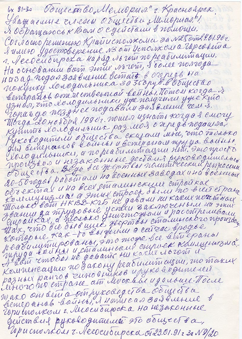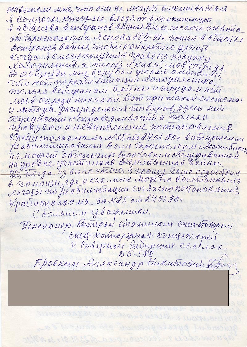 На основании вот этих льгот я более полгода назад подал заявление встать в очередь на покупку холодильника за 350 руб. в общество ветеранов отечественной войны. Потом когда я узнал, что холодильники уже получили уже кто гораздо позднее подавали заявление чем я. Тогда 20 ноября 1990 г. пошел узнать когда я смогу купить холодильник раз моя очередь подошла. Руководители общества сказали мне, что только для ветеранов войны и ветеранам труда воны холодильники, а по реабилитации нет. Это просто произвол и незаконные действия руководительств. общества. Ведь все жертвы политических репрессий 20-5- годов работали на военных заводах и на военных объектах и на всех сталинских стройках «коммунизма» а этих строек были по всей стране. Только вот НКВД-КГБ не давали никаких почетных званий за трудовые успехи заключенным на этих стройках, а только уничтожали и расстреливали. Так, что все бывшие жертвы сталинского произвола, которые как-то выжили а сейчас вроде реабилитированы, это все ветераны труда войны и «сталинских строек коммунизма». А вот чтобы не давать никаких льгот и компенсаций по закону реабилитации, то таких разных рангов чиновников и руководителей много по стране от Москвы и дальше. После такого ответа руководства общества ветеранов войны, я написал заявление в горисполком г. Лесосибирска на незаконные действия руководителей этого общества. Горисполком г. Лесосибирска от 23.01.91 г. за № 9/20 ответили мне, что они не могут вмешиваться в вопросы, которые входят в компетенцию общества ветеранов войны. После такого ответа от Горисполкома я снова 28/I-91 г. пошел в общество ветеранов войны, чтобы конкретно узнать когда я смогу получить право на покупку холодильника то есть и какая моя очередь. В обществе мне в грубой форме ответили, что нет по реабилитации холодильника, только ветеранам войны и труда и нет моей очереди никакой. Вот при такой системе и методе распределения товаров, здесь нет очередности и справедливости а только произвол и невыполнение постановления Крайисполкома за №25 от 24.02.90 г. в отношении реабилитированных. Если Горисполком г. Лесосибирска не может обеспечить торговым обслуживанием на уровне участников отечественной войны то, тогда из всего этого я прошу Ваше содействие в помощи, где и как мне можно восстановить льготы по реабилитации согласно постановления Крайисполкома за № 25 от 24.01.90 г.