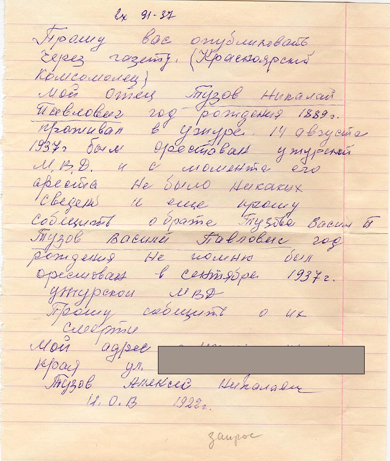 И еще прошу сообщить о брате Тузова. Тузов Василий Павлович, год рождения не помню, был арестован в сентябре 1937 года Ужурским МВД.