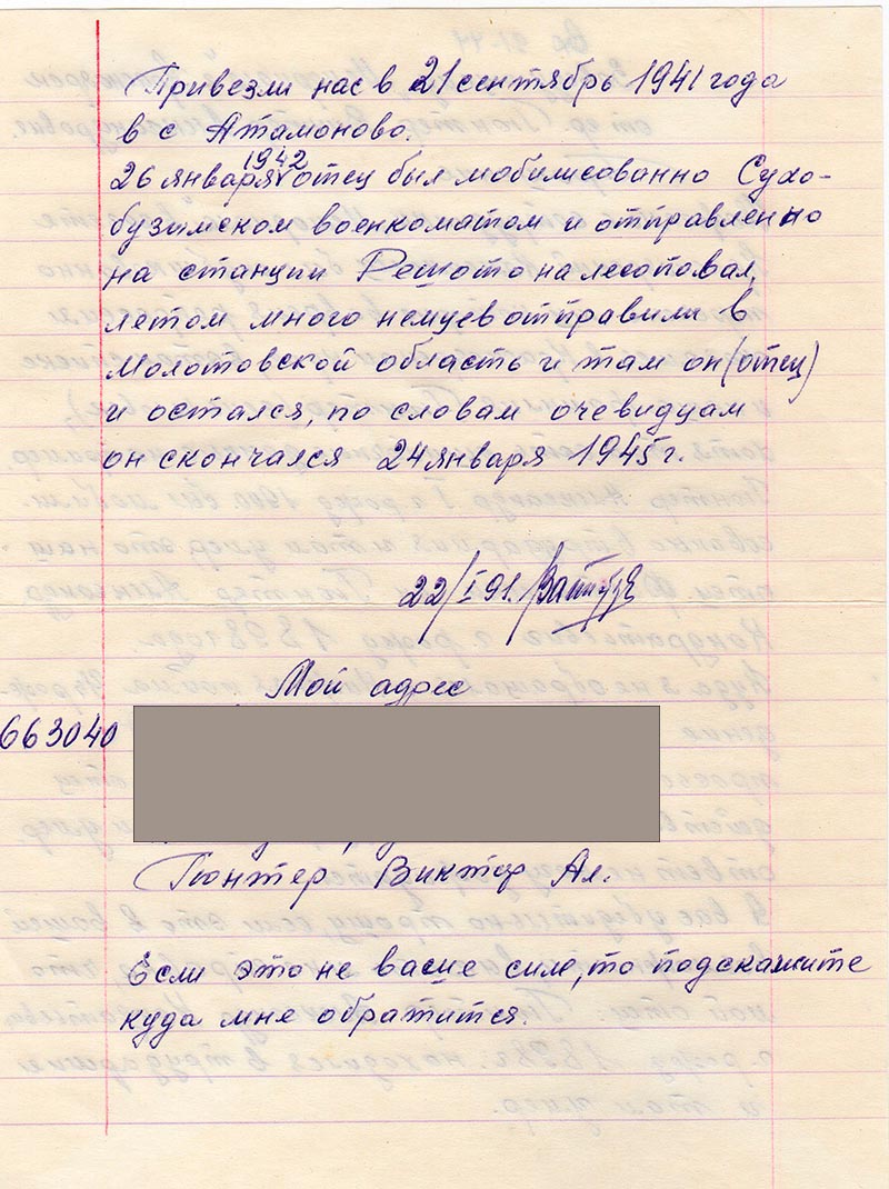26 января 1942 отец был мобилисованно Сухобузимском военкоматом и отправлено на станции Решото *прим. Решоты на лесоповал, летом много немцев отправили в Молотовской область и там он (отец) и остался по словам очевидцам он скончался 24 января 1945 г.