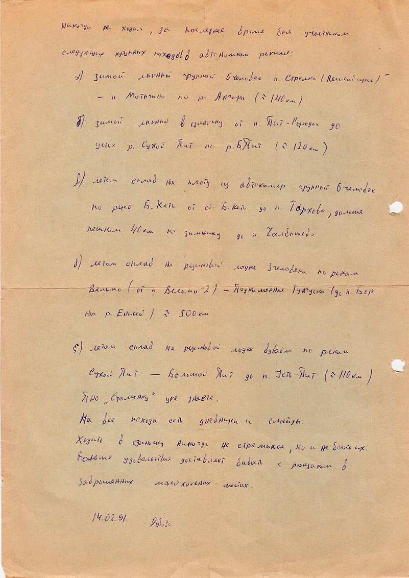 в) летом сплав на плоту из автокамер группой 6 человек по реке Б. Кеть от ст. Б. Кеть до п. Тархово, дальше пешком 40 км по зимнику до п. Чалбышево