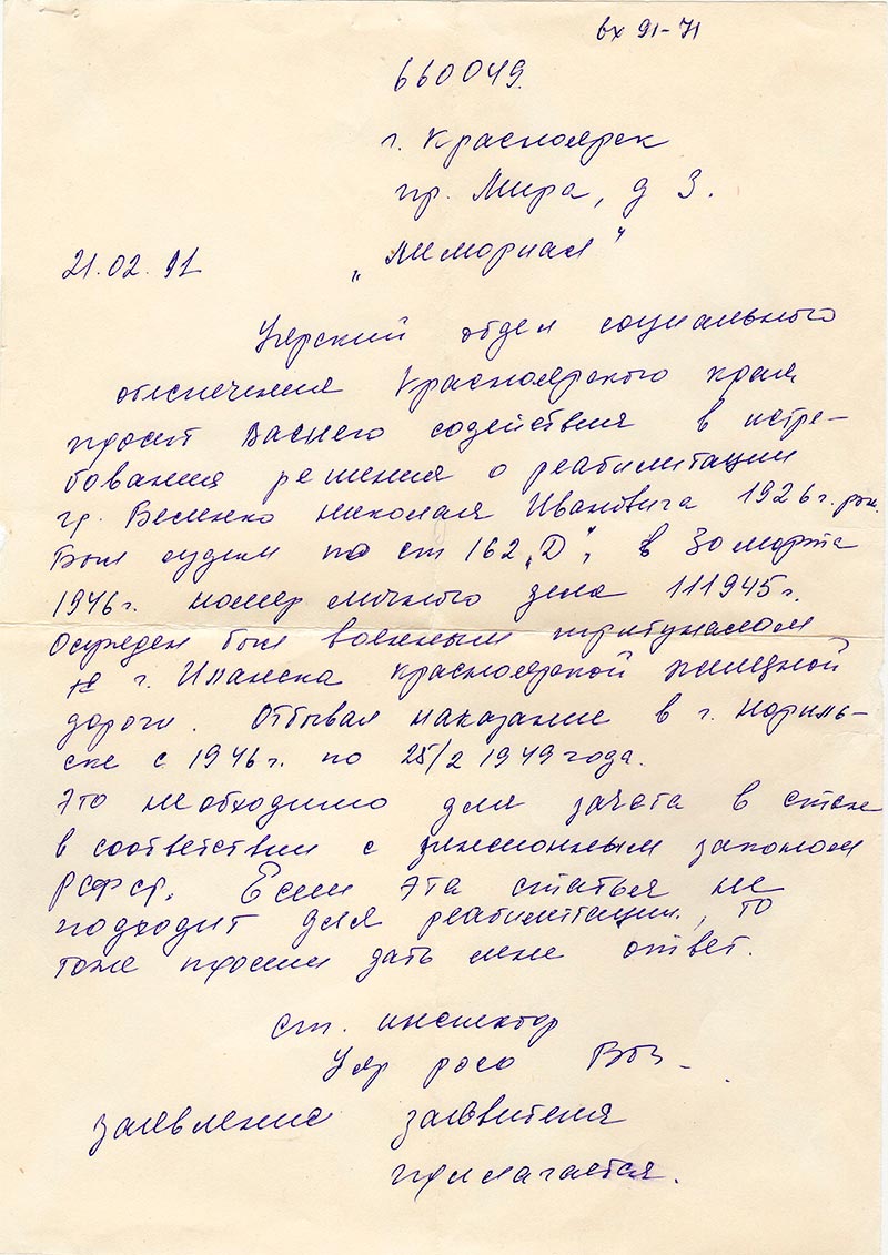 Приговор огласили Косоухову Ивану Егоровичу 4 года по ст. 162 Д (умер), Панферину Николаю Павловичу по ст. 162 Д 3 года, мне Беленко Николаю Ивановичу по ст. 162 Д 3 года. Я отбывал срок наказания в Норильске, отбыл срок наказания, вернулся домой в Уяр и стал работать стрелочником составителем до ухода на пенсию, но дело в том, что где бы я не был за мной так и ходит хвост судимости, где я только не обращал не кто мне не оказывает помощи о реабилитации, писал в Новосибирск. Военный трибунал не сохранились документы, а мне нужны документы для райсобеса о реабилитации. Прошу я вас помогите пожалуйста только ваша истина правды.