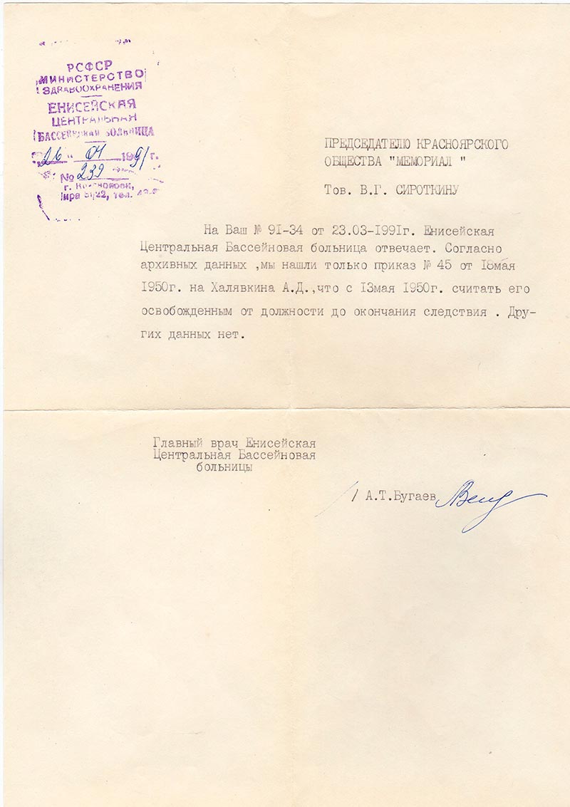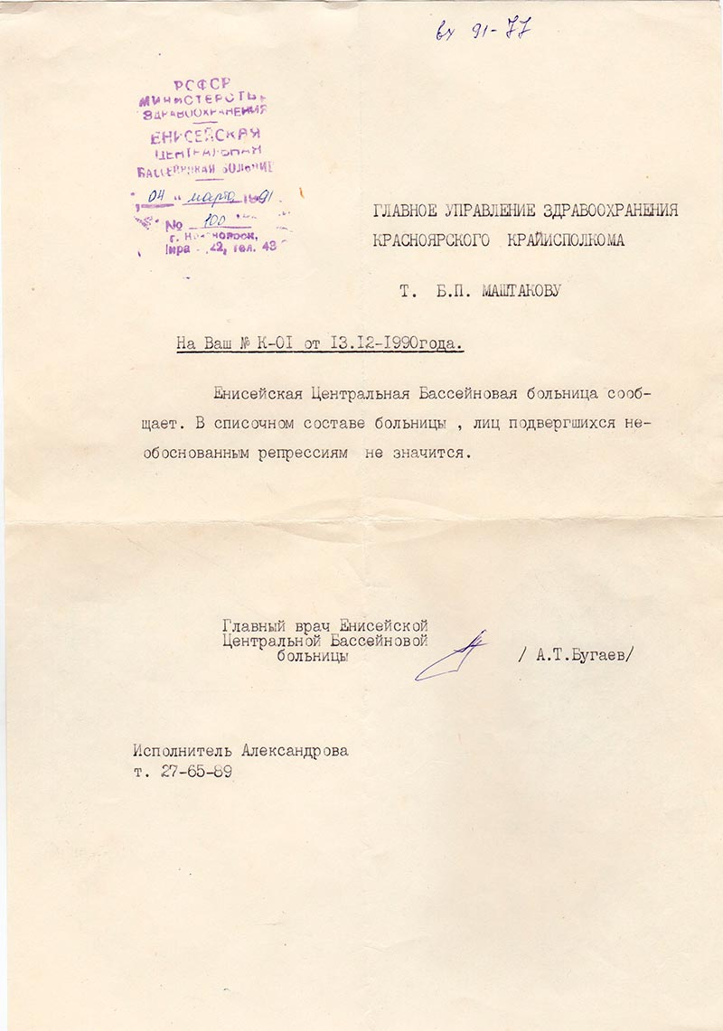 На Ваш №91-34 от 23.03-1991 г. Енисейская Центральная Бассейновая больница