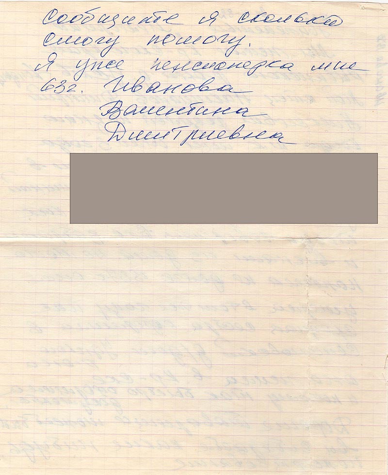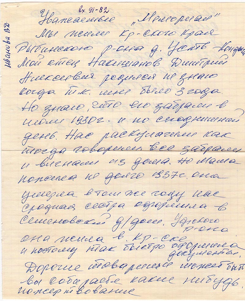 Мы жили Кр-ского края Рыбинского р-она д. Усть-Кондыга. Мой отец Накишанов Дмитрий Алексеевич родился не знаю когда т.к. мне было 3 года. Но знаю, что его забрали в том 1930 г. и по сегодняшний день. Нас раскулачили как тогда говорили, все забрали и выгнали из дома. Но мама пожила не долго 1937 г. она умерла. В том же году нас сродная сестра оформила в Семеновский д/дом Уярского р-на. Она жила в Кр-ске и поэтому так быстро оформила документы.