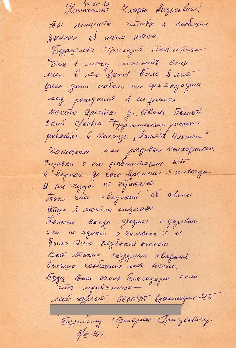 Вы пишите, чтобы я сообщила об моем отце Буршина Григория Яковлевича. Что я