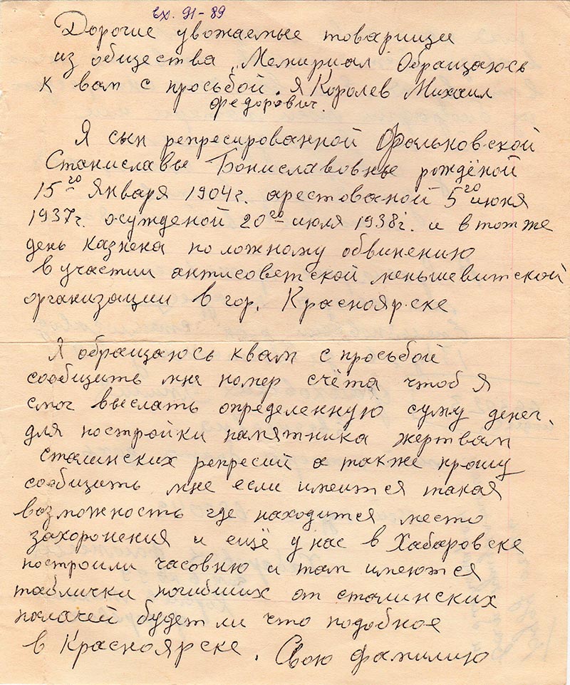 Я обращаюсь к вам с просьбой сообщить мне номер счета чтоб я смог выслать определенную суму денег для постройки памятника жертвам сталинских репресий а также прошу сообщить мне если имеется такая возможность где находится место захоронения и еще у нас в Хабаровске построили часовню и там имеются таблички погибших от сталинских палачей будет ли что подобное в Красноярске. Свою фамилию имя и отчество я изменил в связи обстоятельств имевших место в то время. Если вас что интересует из биографии моей матери или моей то впоследующим могу сообщить из имеющихся у меня документов я также своей памяти.