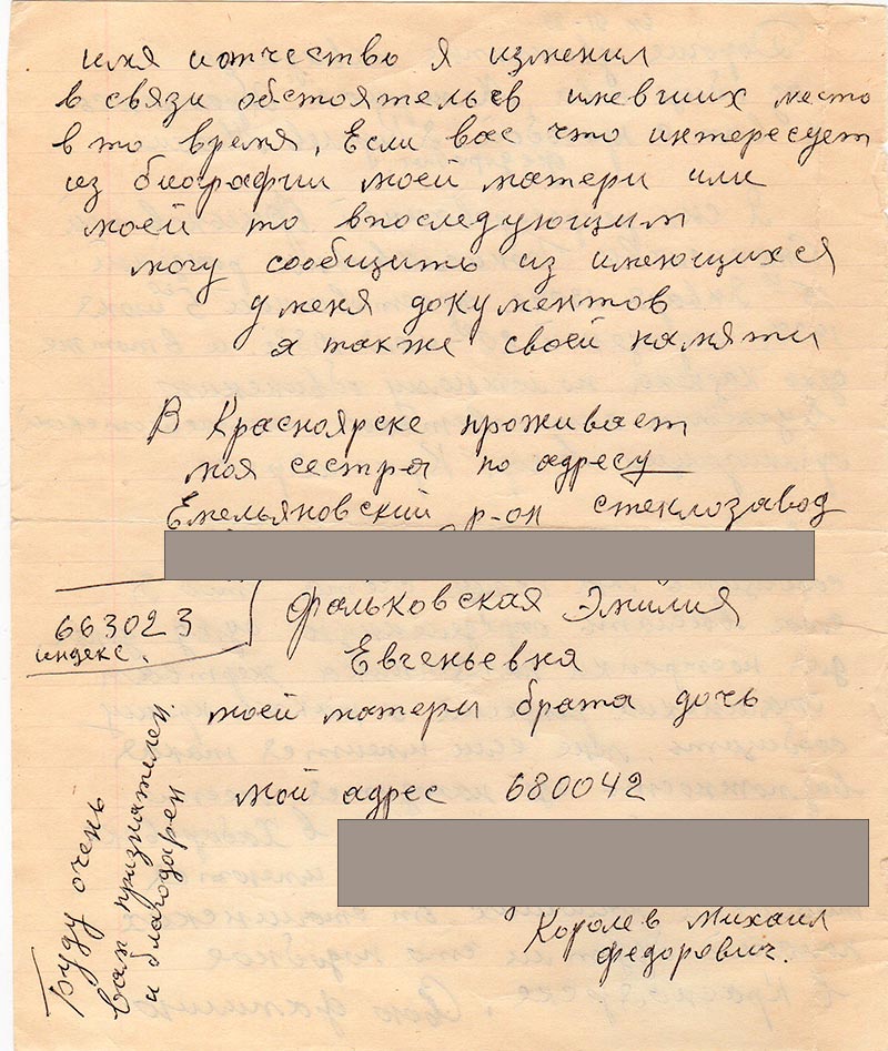 Дорогие уважаемые товарищи из общества «Мемориал». Обращаюсь к вам с просьбой. Я Королев Михаил Федорович.