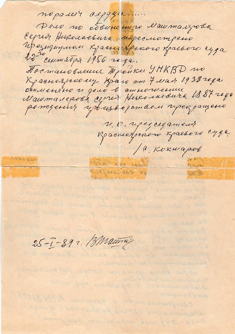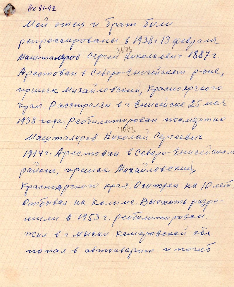 Машталеров Николай Сергеевич 1914 г. Арестован в Северо-Енисейском районе, прииск Михайловский, Красноярского края. Осужден на 10 лет. Отбывал на Колыме. Выехать разрешили в 1953 г. реабилитирован. Жил в г. Мыски Кемеровской обл. попал в автоаварию и погиб.