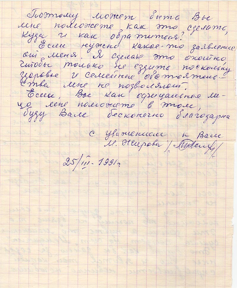 Я хочу сделать другое, что если положено, то почему не взять, т.е. эти деньги, а пусть это маленькая сумма пойдет на счет «Мемориала». Это будет как бы данью за содеянное зло и явится той каплей справедливости неповинно погибших.