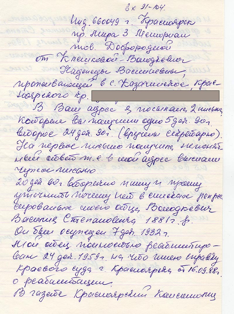 В газете Красноярский Комсомолец напечатаны списки репрессированных, а фамилии Володкевич Василия Степановича нет за 14 июня и 3 июля 1990 г. Еще раз прошу проверить, дополнить в списках и сообщить мне по указанному выше адресу.