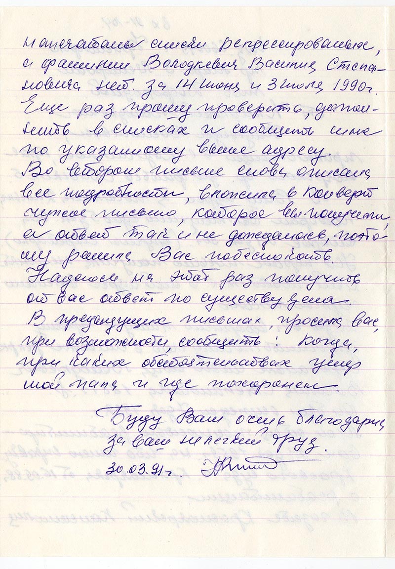 20 дек. 90 г. вторично пишу и прошу уточнить почему нет в списках репрессированных моего отца, Володкевич Василия Степановича 1881 г.р.