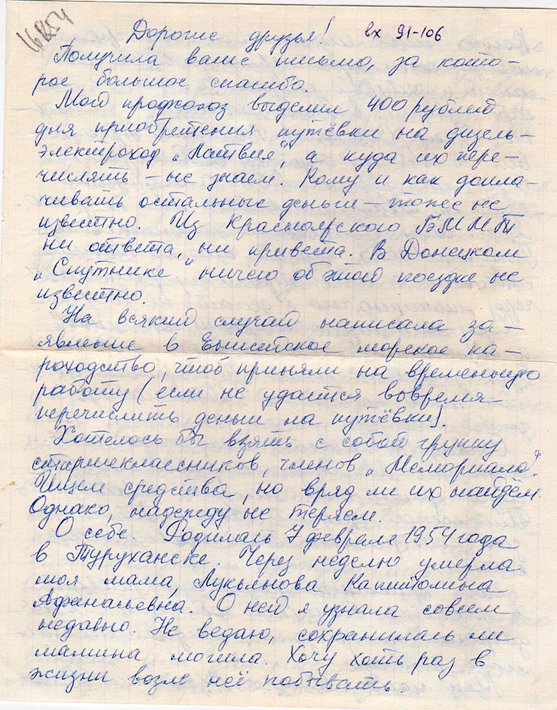 На всякий случай написала заявление в Енисейское морское пароходство, чтобы приняли на временную работу (если не удастся вовремя перечислить деньги на путёвку).