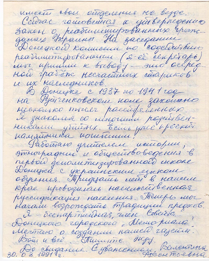 Я – беспартийная, член Совета Донецкого городского «Мемориала» Мечтаю о создании нашей газеты.