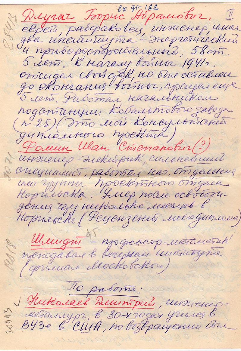 Длугач Борис Абрамович, еврей, рабфаковец, инженер, имел два института – энергетический и приборостроительный, 58 ст. 5 лет. К началу войны 1941 г. отсидел свой срок, но был оставлен до окончания войны, просидел ещё 5 лет. Работал начальником подстанции Кобальтового завода (n 25) (Это мой консультант дипломного проекта). Комментарий: (*28413)