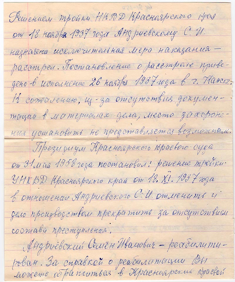Андриевский Семен Иванович – реабилитирован. За справкой о реабилитации Вы можете обратиться в Красноярский краевой суд (постановление Д – № 44 – У – 336 с.).