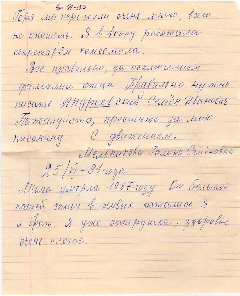 Большое Вам спасибо, что Вы помогли мне узнать полную правду об отце. Я получила их управления КГБ при СМ СССР по Красноярскому краю.