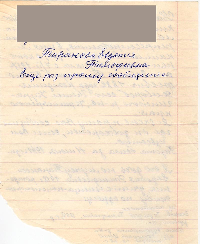 Уважаемая редакция «Красноярский комсомолец». Я прочитала в Вашей газете списки репрессированных, в них я нашла своего отца, о котором ничего не знала с 7/IX-1937 г. Это Зенков Тимофей Тимофеевич 1882 года рождения хлебороб село Имисс Курагинского р-на, Красноярского края.