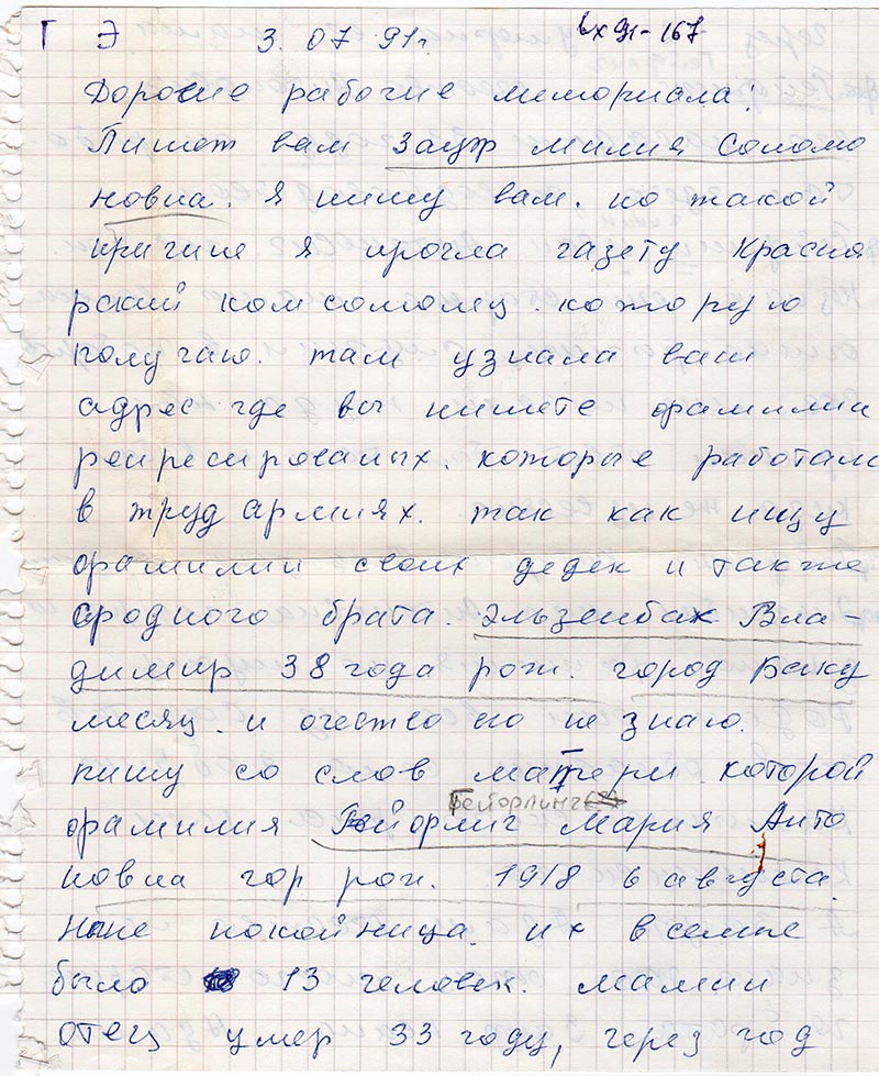 Пишет вам Зауэр Милия Соломоновна. Я пишу вам, по такой причине я прочла газету Красноярский комсомолец, которую получаю. Там узнала ваш адрес где вы пишите фамилии репресированных, которые работали в труд армиях, так как ищу фамилии своих дедек и также сродного брата Эльзенбах Владимир 38 года рож. город Баку. Месяц и очество его не знаю. Пишу со слов матери которой фамилия Гейфлиг (пометка карандашом: Гейфлинг) Мария Антоновна год рож. 1918 6 августа. Ныне покойница.