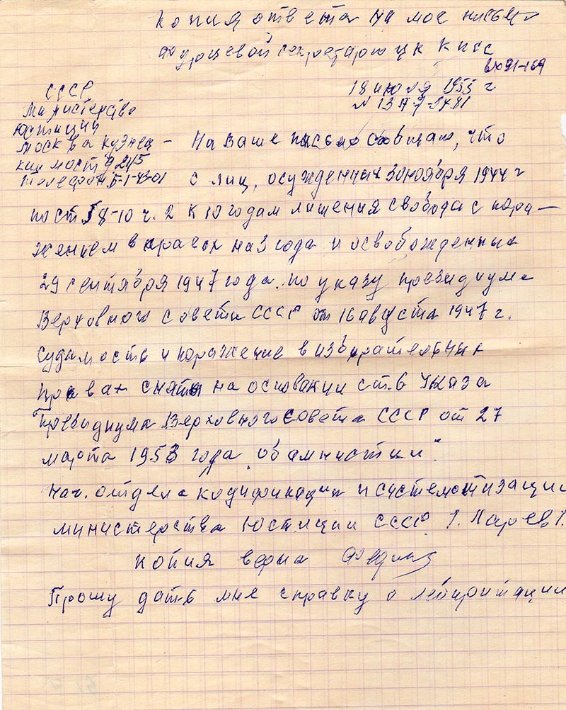 На Ваше письмо сообщаю, что с лиц, осужденных 30 ноября 1944 г по ст.58-10 ч.